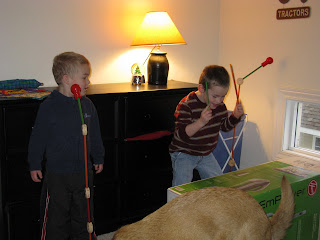Meet the newest boy band! Alls ya need are Tinkertoys (thanks Granny and Grampa), an empty vacuum box and a little imagination!